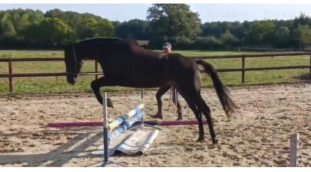 Jolie jument noire 8 ans, avec de belles allures. Douée sur les obstacles à pied. Très énergique, il lui faut EXCLUSIVEMENT un cavalier confirmé. Vidéo disponible