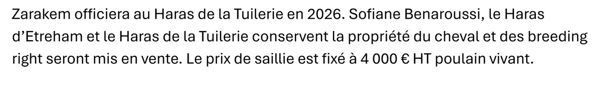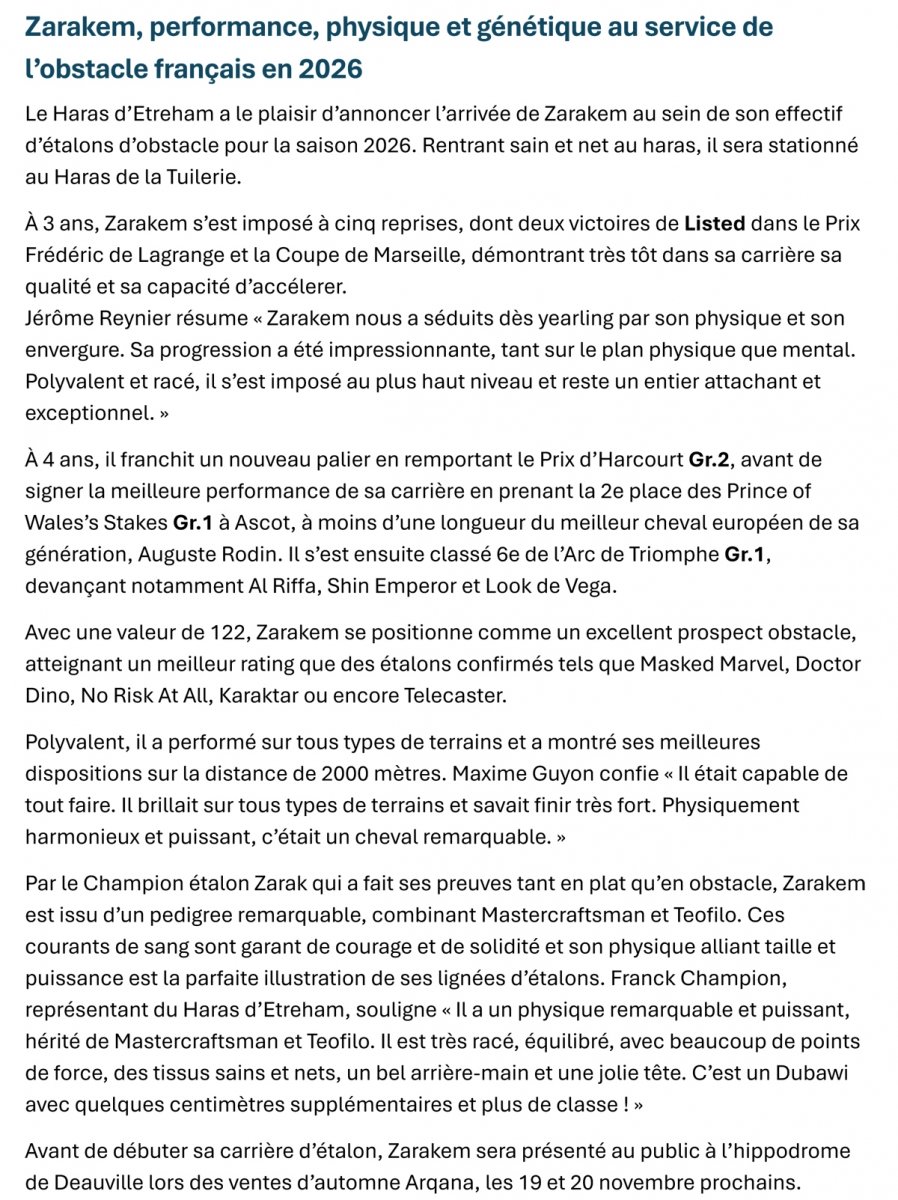 Lui qui fut l'un des meilleurs 4 ans en Europe en 2024, Zarakem s'installe étalon en 2026 au Haras de la Tuilerie. Il est de retour d'Australie, ce qui n'est pas sans rappeler en cela le destin de Masked Marvel, qu'il rejoindra d'ailleurs aux bons soins de Camille et Guillaume Sarda qui s'occupent de la cour d'étalons d'obstacle d'Etreham.