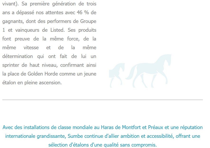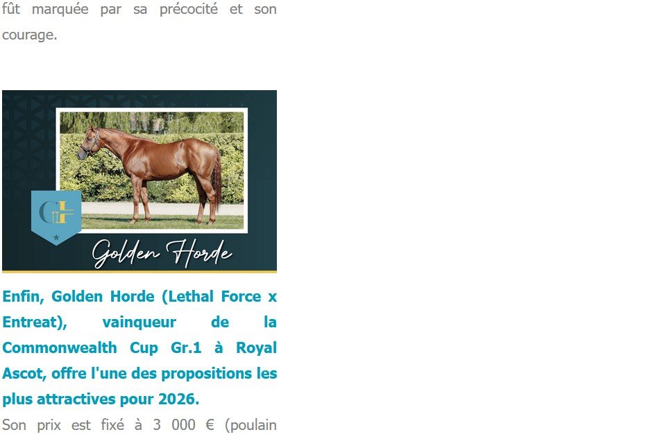Entré au haras en 2021, Golden Horde traverse une belle période de forme avec sa 1ère génération. L’étalon de Sumbe a signé 3 victoires en 4...