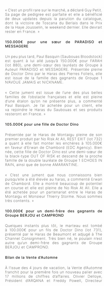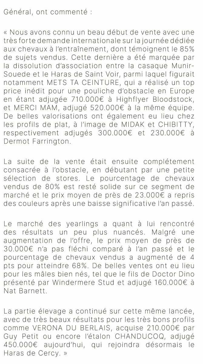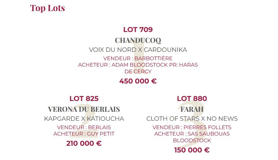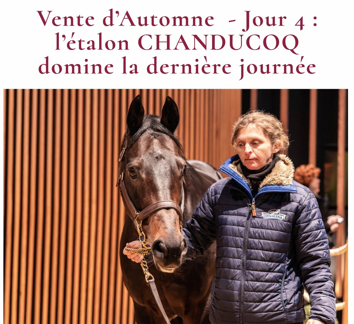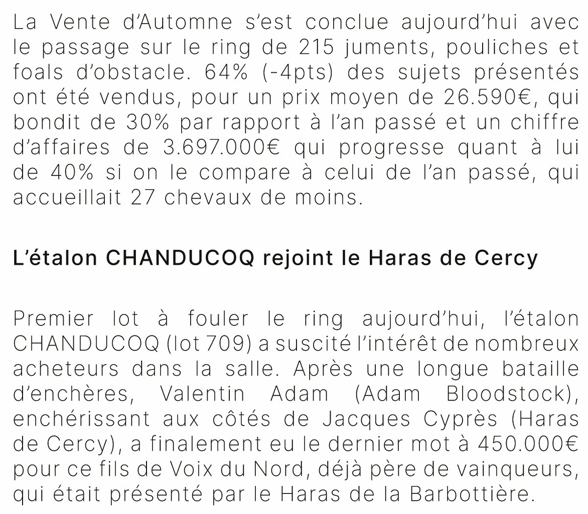 Un coup de tonnerre a retenti sur le ring d'Arqana en ouverture de la vente d'automne élevage avec la vente pour 450.000 € de l'étalon Chanducoq par le Haras de Cercy. Jacques Cyprès explique en détail les raisons de l'acquisition du frère de Cokoriko. Voir le bilan complet de la journée.