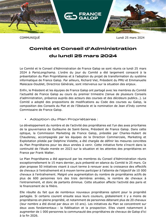 Ce lundi 29 janvier, le Conseil d'administration de France Galop s'est réuni au siège afin d'étudier différents dossiers, en particulier l'évolution des primes propriétaires en plat,...