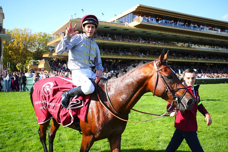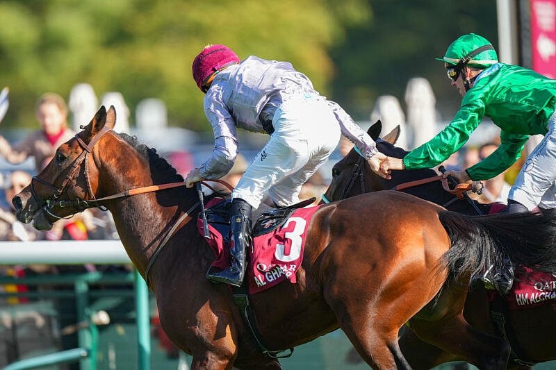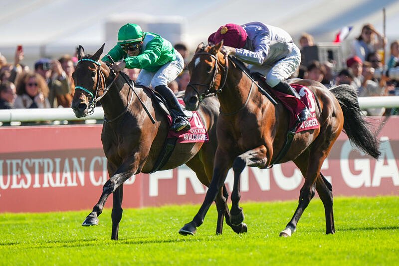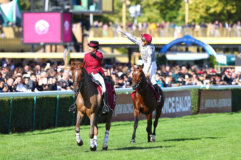 Al Ghadeer (Christophe Soumillon) et Hm Alchahine (Cristian Demuro), deux tandems qui auront marqué de leur empreinte l'édition 2025 de la Qatar Arabian World Cup (Gr.1 PA) à ParisLongchamp (© APRH)