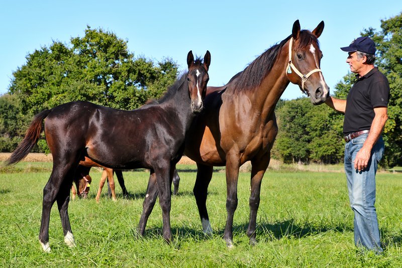 Jaillo, alors foal, aux côtés de sa mère, Jade de la Palisse, et de l'un de ses éleveurs, Marc Minvielle