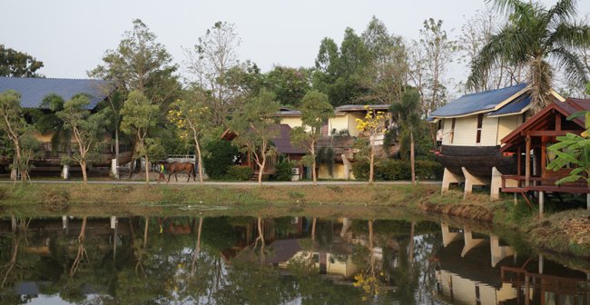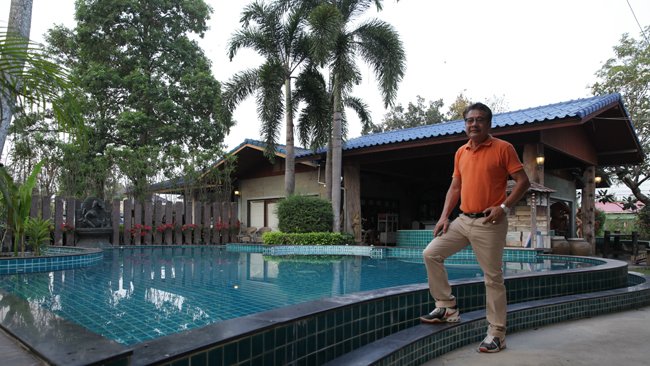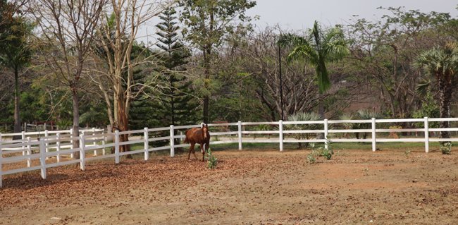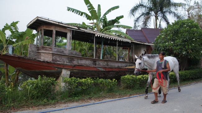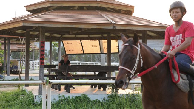 On s'est fait emmener à Swang Chai Farm par un type complètement atypique, Sunate Burakasi Korn, surnommé Tao, 45 ans, riche, causant, joueur de batterie dans un groupe de rock. Habillé en jean fashion, basket de jeune et en T Shirt orange, il détonne complèment au milieu de la bourgoisie hippique Thaï très guindée et très discrète. Au début, c'est le seul qui a bien voulu parler avec nous, et il nous a embarqué dès le soir dans son centre d'entrainement, un paradis terrestre qu'il a construit à côté de sa maison et de sa piscine. Vous qui avez tous vu et revu Emmanuelle au cinéma puis sur M6, on dirait que ce chef d'oeuvre a été tourné ici.