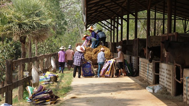 Toutes les souches sont à 100% américaines. Le système est simple : considérant que les sols ne sont pas aptes à améliorer la qualité des animaux, les propriétaires-éleveurs, un club de quelques riches qui entretiennent tout le système, achètent aux Etats-Unis des juments de secondes zones pleines d'étalons sortis du ventre mou du Kentucky. Les produits importés in utéro seront en général les meilleurs de la génération en Thaïlande. Ensuite, les juments continuent de produire sur place, croisées avec des étalons locaux, qui eux aussi proviennent d'Amérique, mais où ils n'avaient pas ou plus leur place dans l'élite. Nous avons visité, dès le lendemain de notre 1e jour au courses, à Pakchong, un des grands haras du pays, Swang Chaï Farm, appartenant à un drôle de type nommé Vu Thi Pong, qui est un grand fan des paons. Il y en a des centaines qui nous cassent les oreilles sur les 180 hectares du domaine, très vallonné mais aussi totalement désseché. Les chevaux mangent du pingolla, sorte de foin local très pauvre surtout en calcium et en proteïne. Alors ils sont complémentés avec de la luzerne importée des Etats-Unis. Pour l'état des chevaux, ce n'est pas la joie. Pas étonnant qu'ils soient réputés tardifs malgré leurs origines ultra précoces. Mais on a aussi compris que Swang Chai fait plus dans la quantité que la qualité...