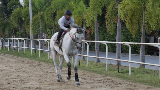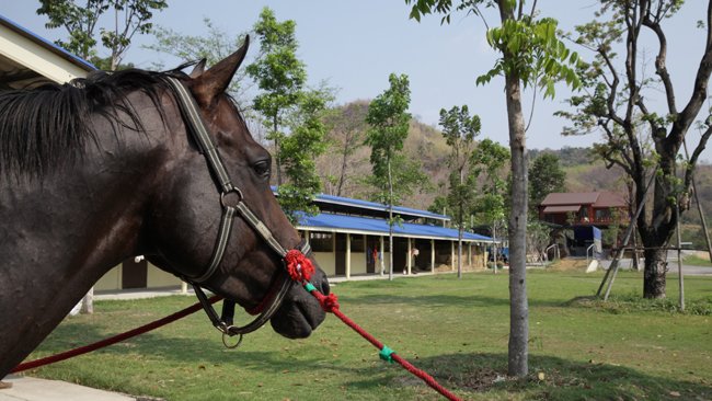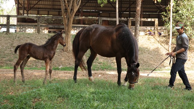 Au niveau des étalons, ici on est fier de British Blue,  un alezan brûlé très bien né, fils de Storm Cat et de la multiple  gagnante de Gr.1 Memories of Silver. Il  a été acquis M$ 2,4 à Keeneland  par Cheikh Mohammed yearling en 2001  mais n'a gagné qu'un gros  handicap, puis a commencé sa carrière en  Floride avant d'arriver en  Thaïlande. Il a 15  ans mais est en pleine santé, ce qui n'est pas le  cas des 2 croulants  Scatmandu (21 ans, par Storm Cat, gagnant de Gr.3) et Alke (15 ans, par Grand Slam,  lui aussi gagnant de Gr.3 mais étalon décevant). Chose  étonnante,  contrairement aux retraités qui se la coulent douce  sur les plages de  Thaïlande, les chevaux ont tendance à très mal  vieillir à partir du cap  de 15 ans dans ce pays, en raison du climat. Cela tient peut-être au  fait que les étalons saillissent toute l'année la 50aine de juments du  haras, car il n'y a pas de saison de monte.  Si une jument tombe en  chaleur, elle est saillie. D'où le fait que sur  les programmes, l'âge  des chevaux est précisée avec le nombre d'années  mais aussi de mois  (par exemple 3 ans 7 mois).