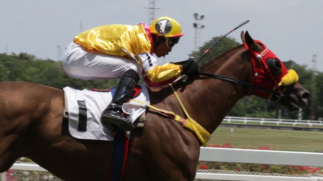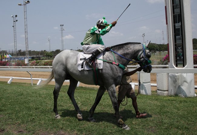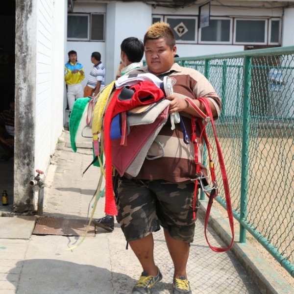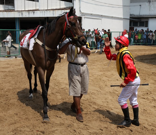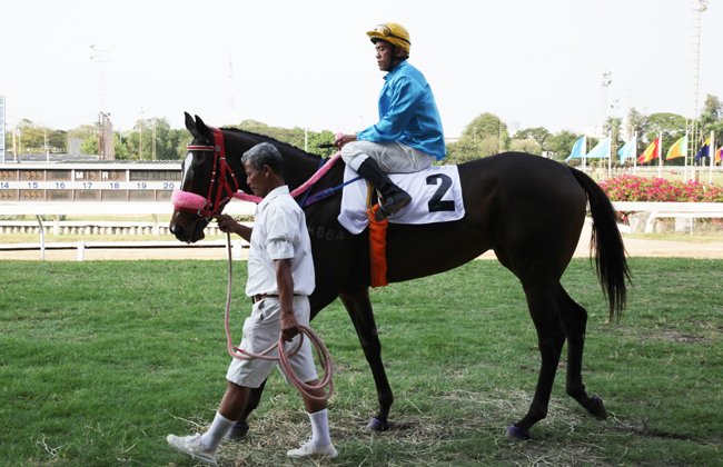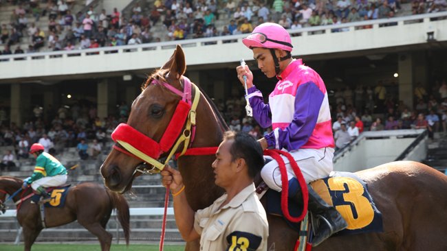 Supakom, le meilleur jockey du pays, salue sa partenaire Similar en approchant de la favorite de la CBM Cup qu'il s'apprête à seller.