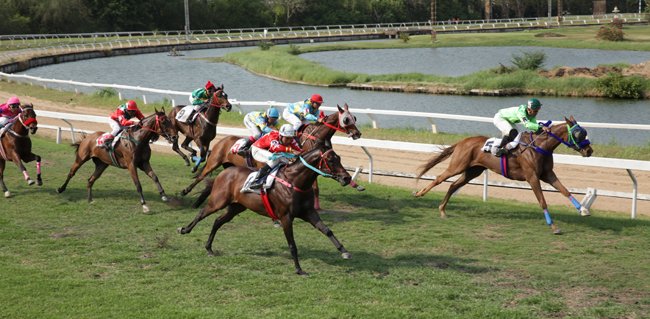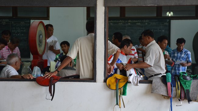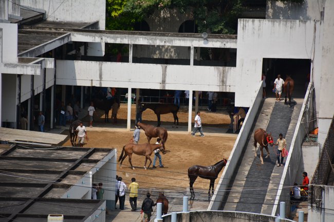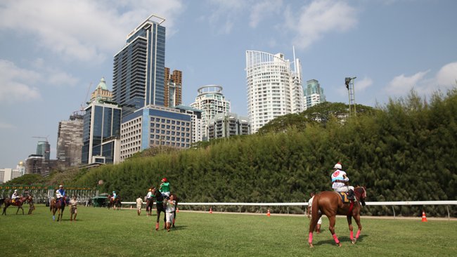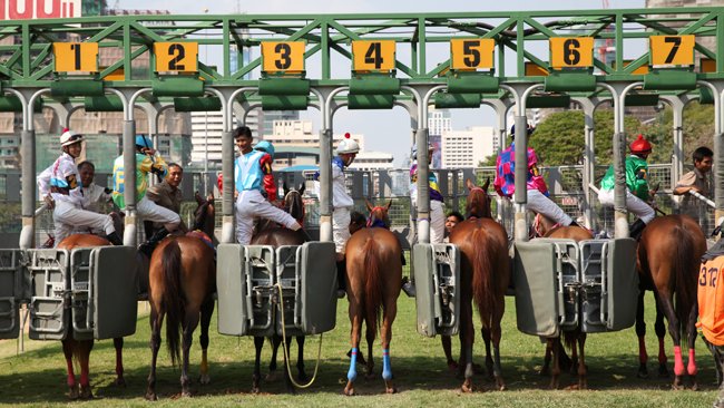 Du monde, des cris, des pur-sangs, des jockeys, une piste plate corde à gauche...bref, du classique. Ou presque, car il se passe ici quelque chose de totalement unique au monde. Première surprise, les chevaux se croisent en sortie de piste : ceux qui reviennent de la course et ceux qui partent pour la suivante, déjà sellés et même montés. Ainsi, seuls quelques rares jockeys parmi les plus demandés peuvent monter 2 courses de suite. Mais une fois entrés devant les stalles, les chevaux patientent, sous une chaleur étouffante, jusqu'à 20 ou 25 minutes ! Les jockeys et le starter discutent de la pluie et du beau temps jusqu'au "dring" d'un vieux téléphone des années 80. En fait, les organisateurs attendent que les jeux soient suffisants pour donner le départ !