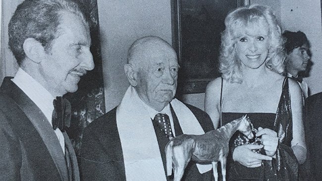 Mireille Darc avec Marcel Boussac, ancienne vedette des courses recevant un cheval d'or en 1978, à 89 ans, un an et demi avant sa mort.