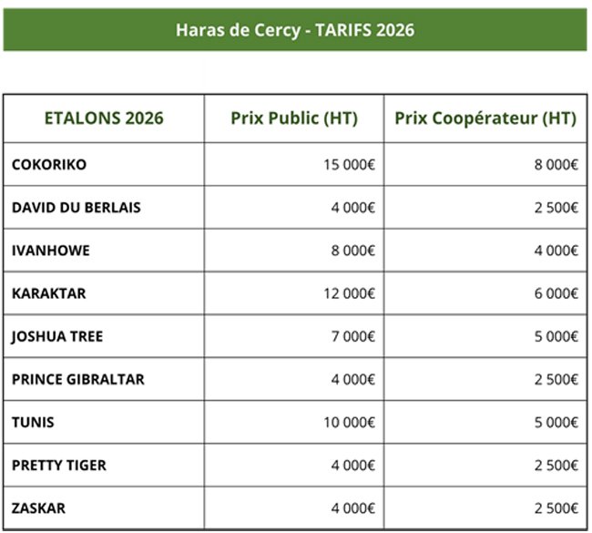 Les prix de saillies du Haras de Cercy pour la saison 2026