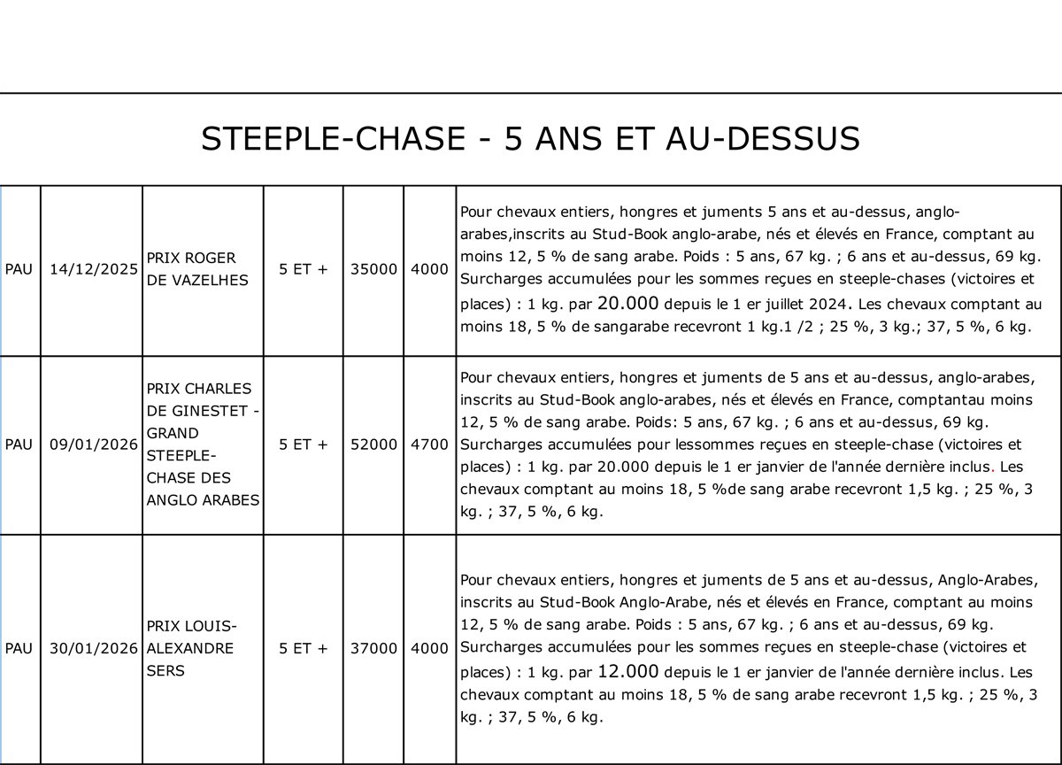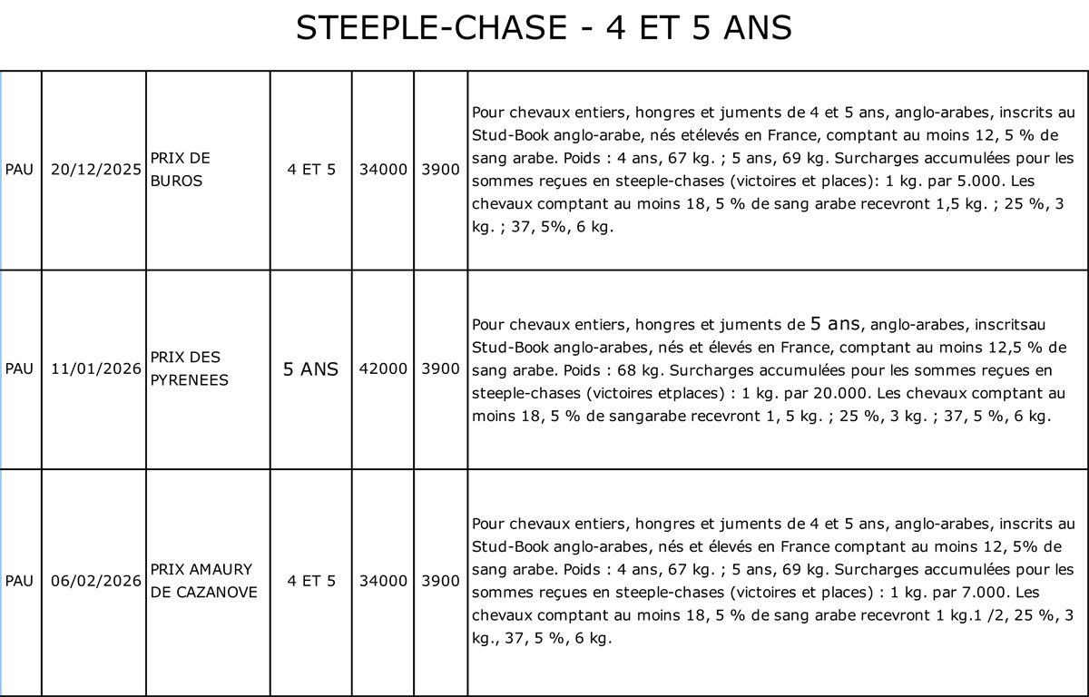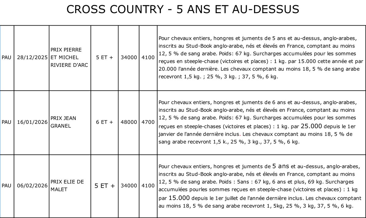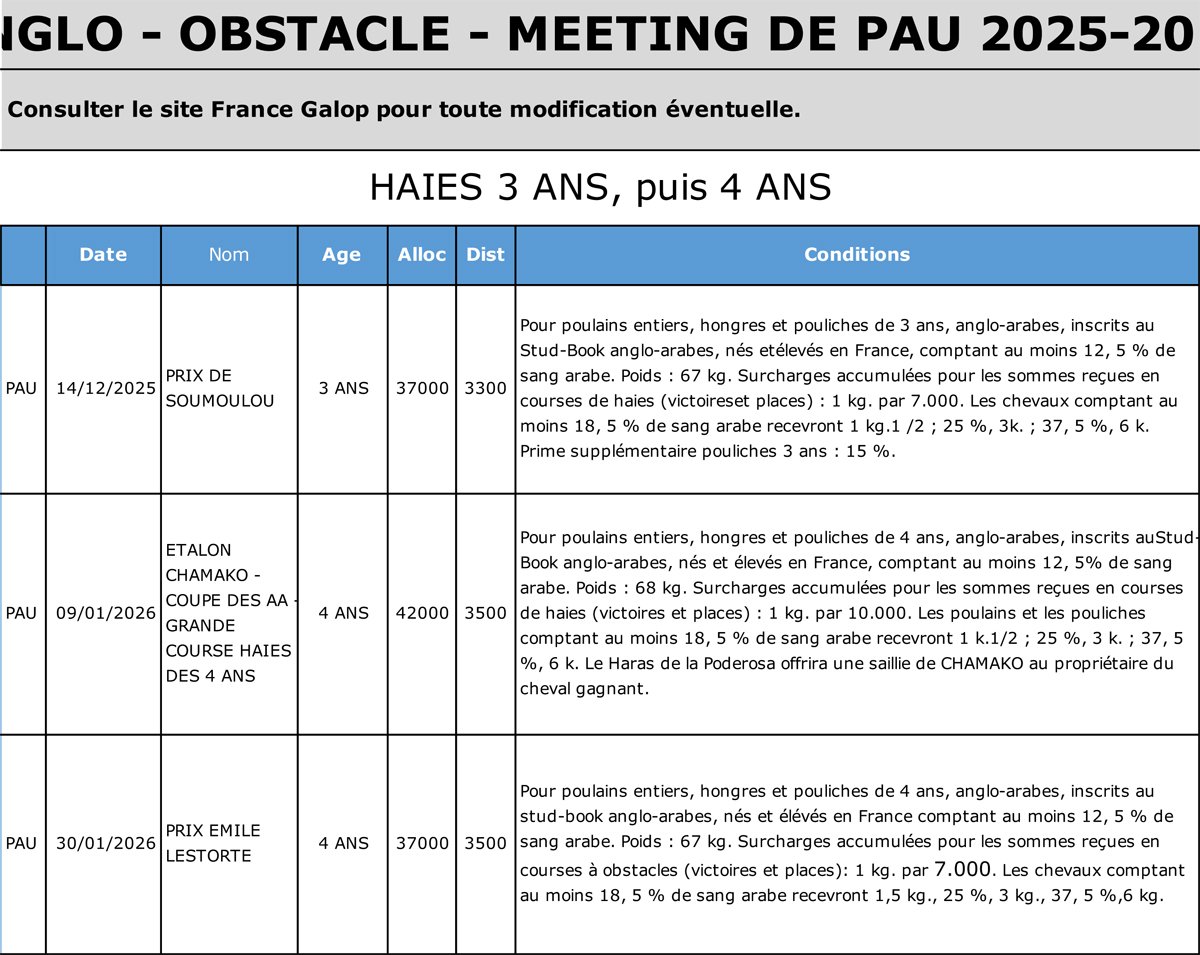 Pas moins de 12 courses seront proposées aux anglo-arabes pendant le meeting de Pau 2025-2026, entre le 14 décembre et le 6 février, depuis les courses de haies de 3 ans jusqu'au cross de chevaux d'âge. Découvrez le programme détaillé ci-dessous.