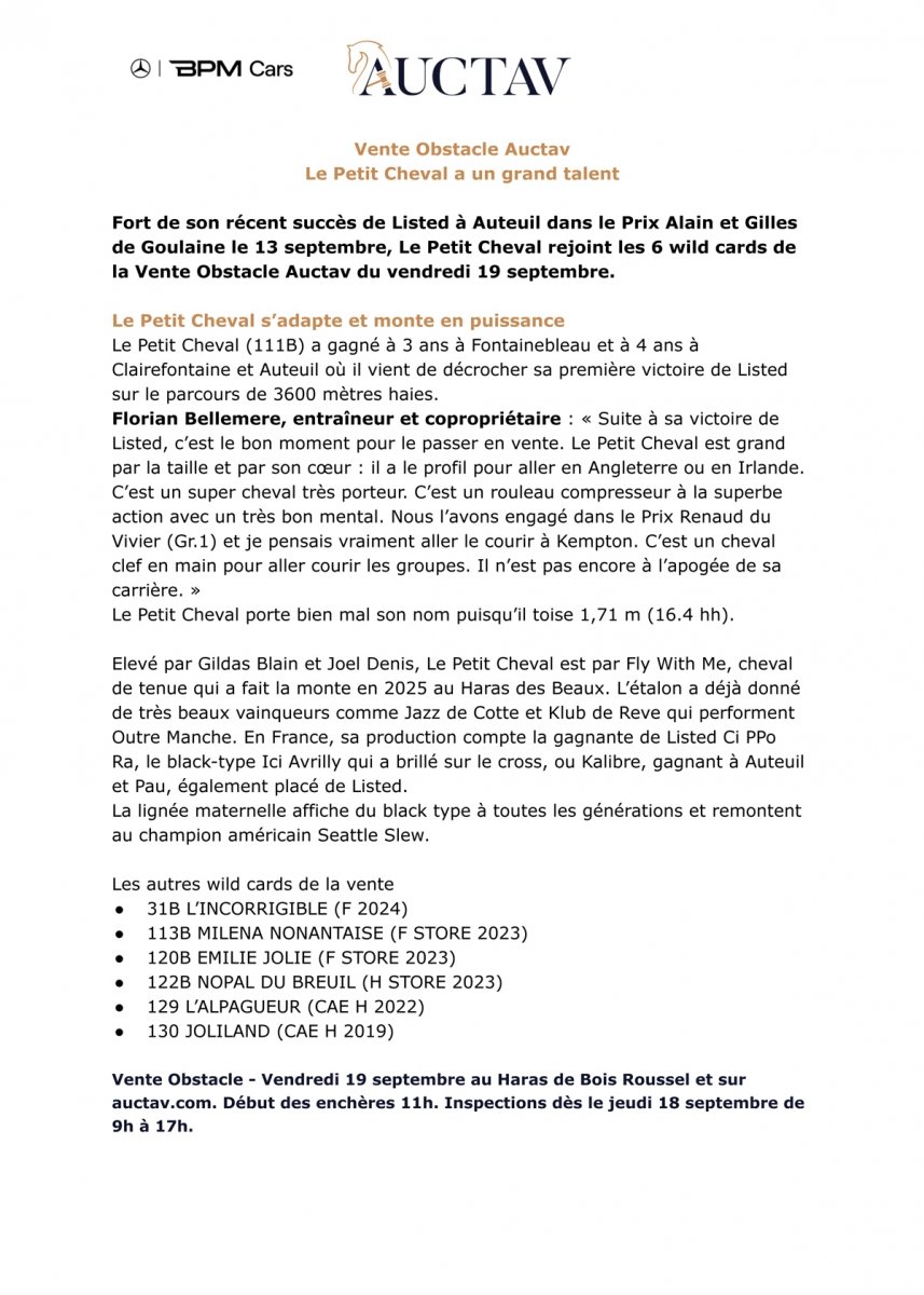 Avec près de 160 lots à passer sur le ring d’Auctav, la vente obstacle avance son horaire de lancement des enchères à 11h. Le catalogue a accueilli 6 wild cards : la dernière est...