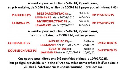 A vendre, pour réduction d'effectif, quatre poulinières PS pleines...