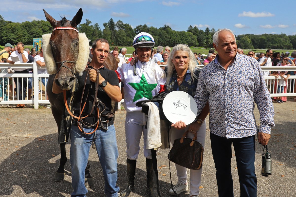 Jafar d'Escar, aux côtés de son "ange gardien", Benoît Lombart, Marie-Anne Bernadet, sa partenaire, et Christelle Courtade, sa metteuse au point, après sa victoire dans l'édition 2023 de la Coupe des Anglo-Arabes à 37.5%, sur l'hippodrome de Pompadour