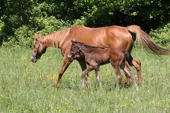 Klitchko de Belair (lorsqu'il était foal) et sa mère Tragi Comédie dans les prés de Pierre de Maleissye.