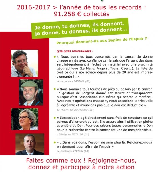 L'association Les Sapins de l'Espoir collecte des fonds pour la recherche et soins contre le cancer avec la particularité de traiter en direct. En effet, l'association achète et remet elle-même le matériel aux hôpitaux. Depuis sa création il y a 22 ans, Les Sapins de l’Espoir a acheté pour plus de 1.100.000€ de matériel. Géographiquement, l'association couvre les hopitaux du Mans, Caen, Tours, Villejuif, Angers, Lisieux, ... Presque 30.000 donateurs ont été enregistrés depuis la création, serez-vous le prochain? De nombreux professionnels de notre filière sont membres des Sapins de l'Espoir.