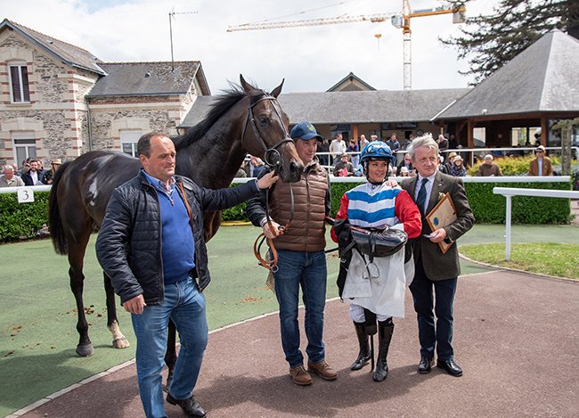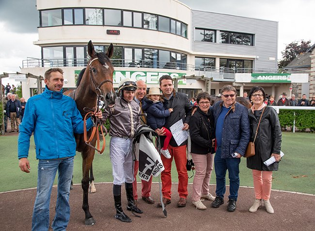 Ludovic Gadbin en famille pour la victoire de sa pensionnaire Pivottina, montée par Adrien Fouassier.