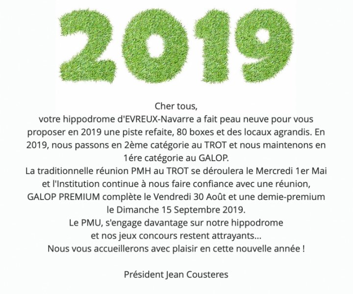 Jean Coustères, Président de la Société des Courses d'Evreux vous adresse ses meilleurs voeux pour cette nouvelle année et vous donne d'ores et déjà rendez-vous pour les courses en 2019.