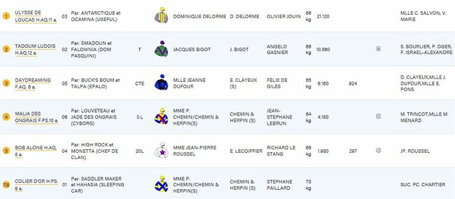 Agé aujourd'hui de 11 ans, Ulysse de Loucas fut très tardive, alignant les échecs jusqu'à une soudaine révélation à 6 ans. Depuis il est devenu très régulier et remporte ici sa 9e victoire, la plus belle de sa carrière. Ce fils d'Antarctique, ancien étalon discret mais efficace chez Daniel Lassaussaye dans l'Orne, l'élève de Valery Marie et Cécile Salvon est le seul vainqueur de sa fratrie.