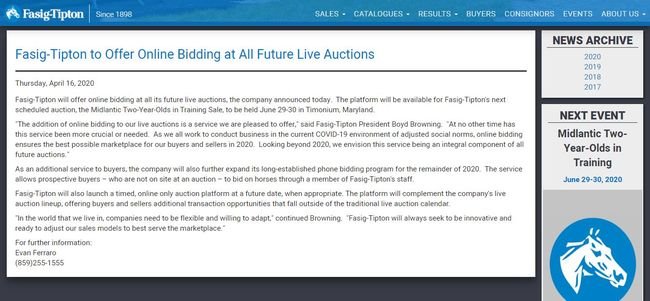 Fasig-Tipton : Enchères en ligne pour ses ventes de 2020