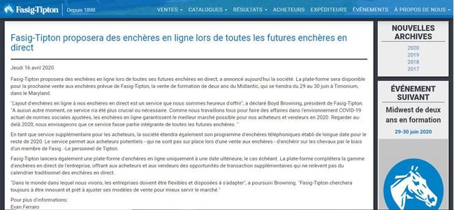 Il y a 15 jours, nous apprenions, sans grande surprise au vu de la conjoncture actuelle, le report de la vente des 2 ans à l’entraînement organisée par Fasig-Tipton de fin mai à fin juin. Cette dernière étant toujours d’actualité, l’organisme de vente américain vient d’annoncer, par un communiqué, que les enchères en ligne feront leur apparition lors de cette vente et que ceci sera déployé pour l’ensemble des ventes se déroulant en 2020. En parallèle de ce système, les enchères par téléphone, déjà instaurées depuis plusieurs années, seront également possibles. Boyd Browning, président de Fasig-Tipton, n’exclut pas la création d’une plate-forme de ventes en ligne pour les prochaines années, si besoin était. Pour l'instant, ce n’est que pour contrer l’épidémie de Covid-19 sévissant actuellement, qui nécessite cette démarche, comme Eric Hoyeau a pu l’annoncer hier, dans son communiqué concernant le report de la Breeze Up de mai.