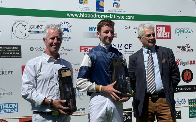 Olivier Trigodet veille sur une trentaine de pensionnaires à La Teste. Et comme un bonheur n'arrive jamais seul (tout comme les emmerdes qui volent en escadrille, selon Jacques Chirac), Olivier Trigodet a réalisé le coup de 2 en ce 6 juillet de gloire. Ainsi, son vénérable Rizzichop, 10 ans, a retrouvé le goût de la victoire après 3 ans de disette ! Il a fait briller son tout jeune jockey de 17 ans, Tom Pauquet, sorti des courses de poneys, vainqueur du championnat de Deauville à 14 ans en 2019. Originaire du Sud-Ouest, Tom Pauquet a débuté en 2021 avec seulement quelques sorties. Il monte plus régulièrement cette année et gagne ici sa 2e course après avoir ouvert son palmarès le 14 mai à Bordeaux-le-Bouscat, en selle sur Becquanon, déjà entrainé par Olivier Trigodet.