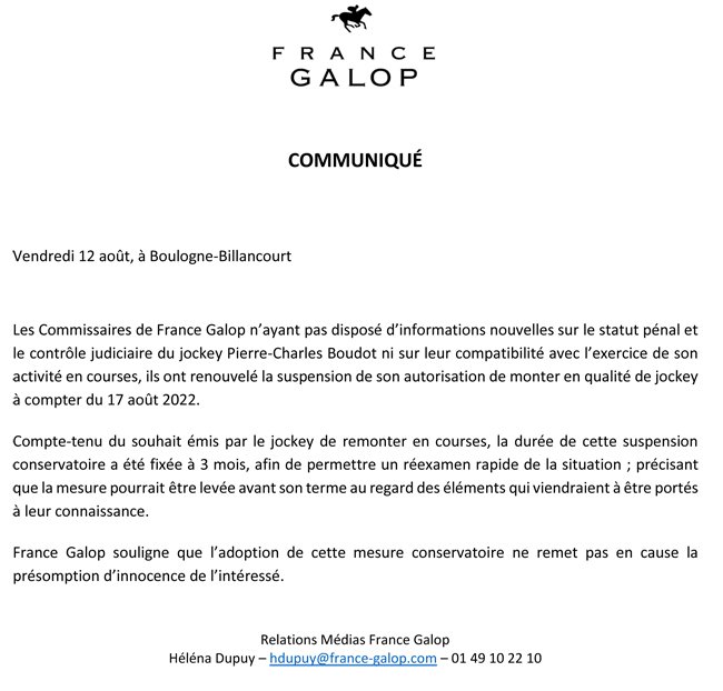 Constatant que la situation pénale et de contrôle judiciaire du jockey Pierre-Charles Boudot est restée inchangée en ce 11 Février 2022, les commissaires de France Galop ont, à titre...