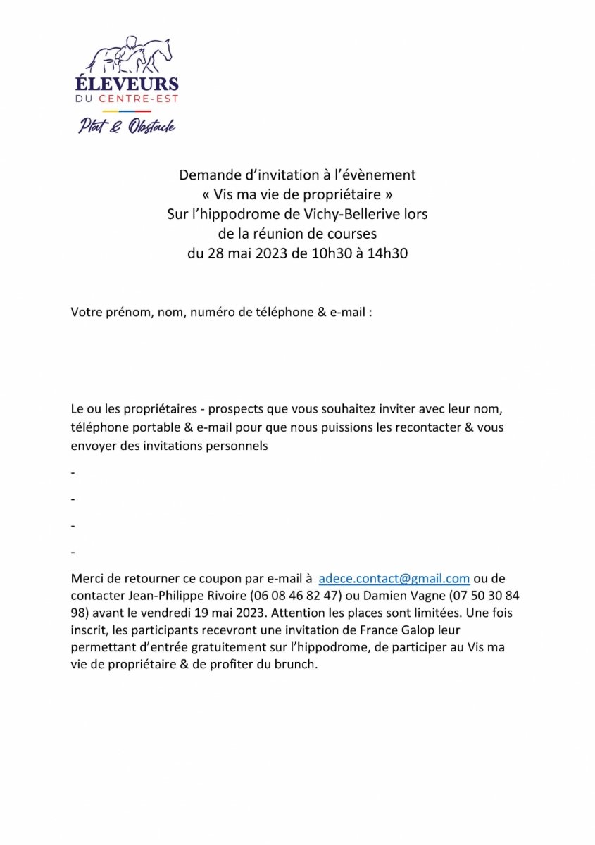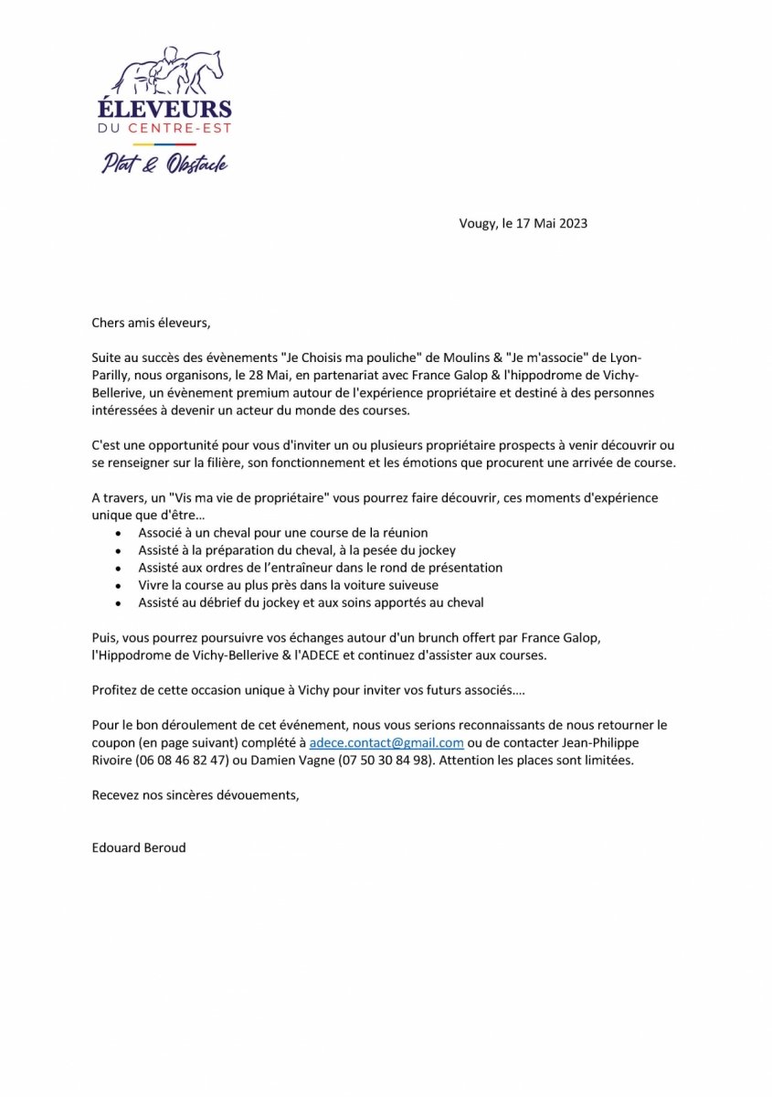 L'Association des Eleveurs du Centre-Est présidée par Edouard Beroud crée une nouvelle opération le dimanche 28 mai sur l'hippodrome de Vichy, en partenariat avec France Galop : " Vis Ma Vie de Propriétaire", afin de faire partager une expérience unique.