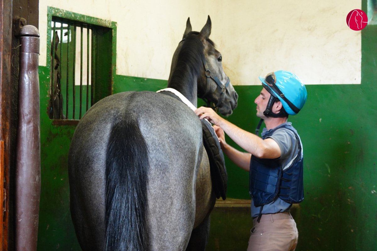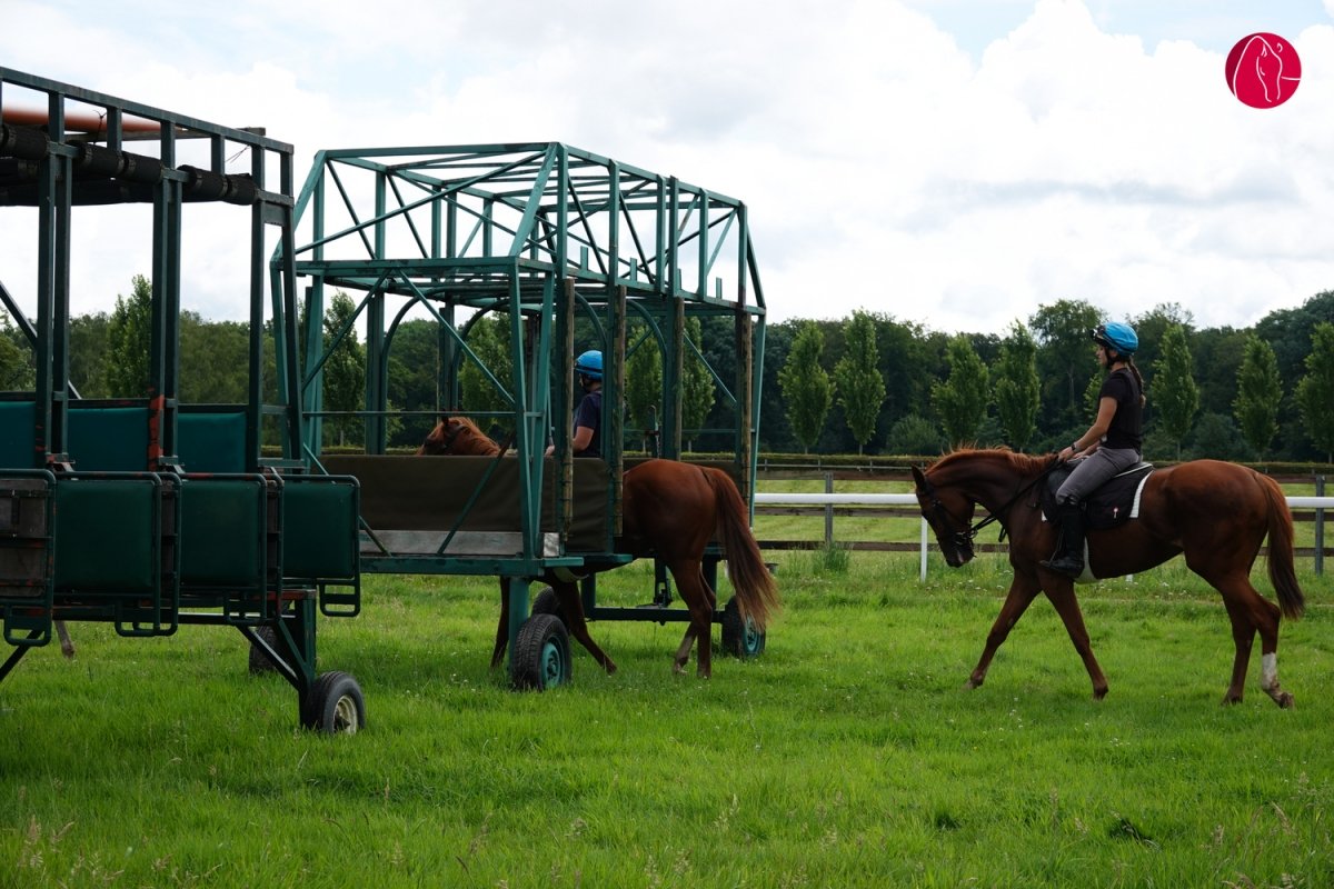 En revenant de la piste, les jeunes chevaux passent dans les stalles chacun leur tour