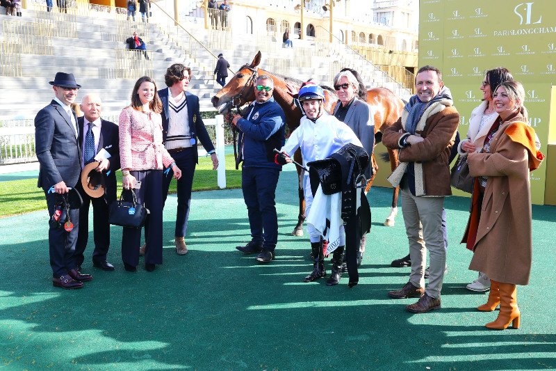 Xavier Marie (à droite, veste marron), le créateur du Haras de Hus, aux côtés de sa championne des hippodromes, Grand Glory (© APRH)