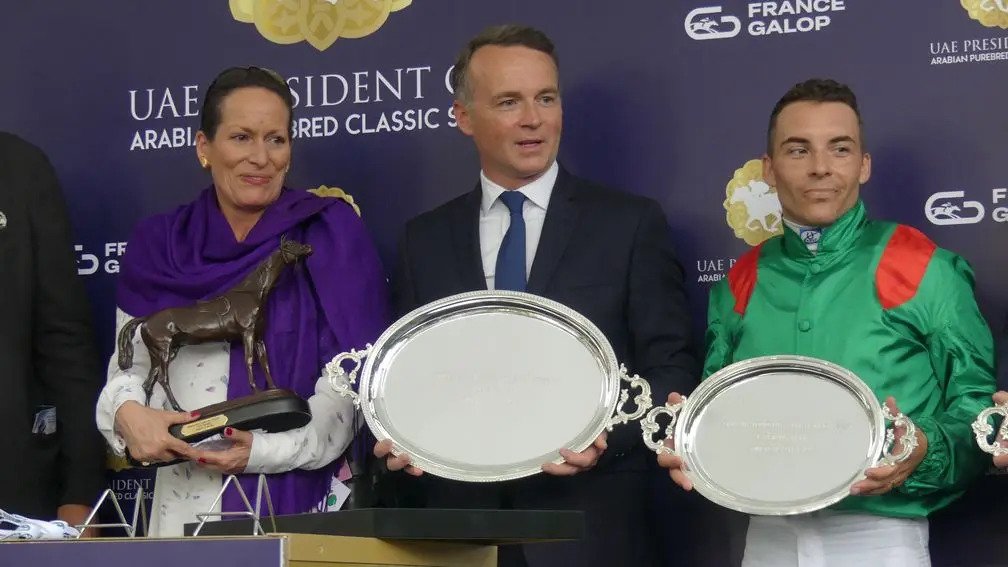Francis Graffard accompagné de la Princesse Zahra Aga Khan après la victoire de Rouhiya dans la Poule d'Essai