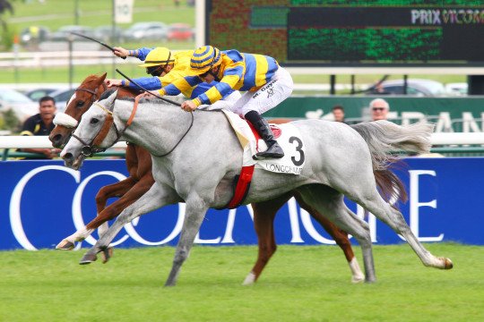 Seul un poil de barbichette s'épare le lauréat Fly With Me (n°3, Maxime Guyon) et sa dauphine Goldtara (CP. Lemaire) dans le Prix Vicomtesse Vigier (Photo APRH)