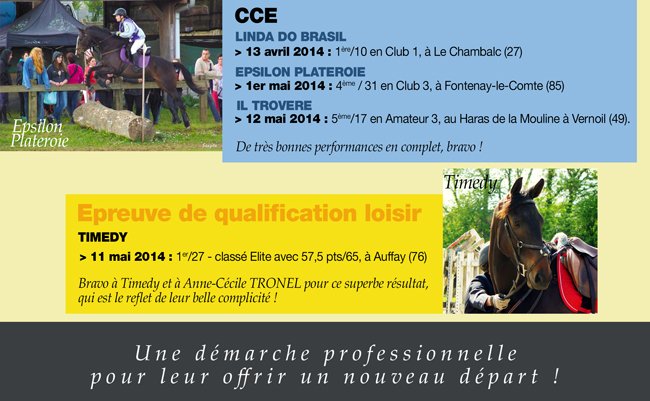 Chaque mois, Amélie Pichon et Sylvain Martin de l'Ecurie Seconde Chance relayent les résultats de leurs anciens pensionnaires en concours. Et si seconde chance rimait avec performances? Ce mois-ci, la victoire de Timedy, ancien pensionnaire de sauveruncheval.com, qui vient de remporter l'épreuve de qualification loisir parmi 27 participants. Ces résultats illustrent la polyvalence des chevaux réformés des courses : de belles performances dans diverses disciplines, CSO, CCE et endurance !