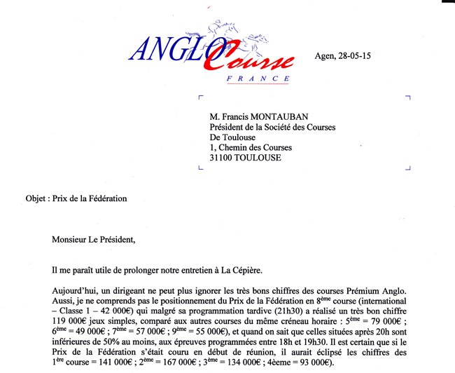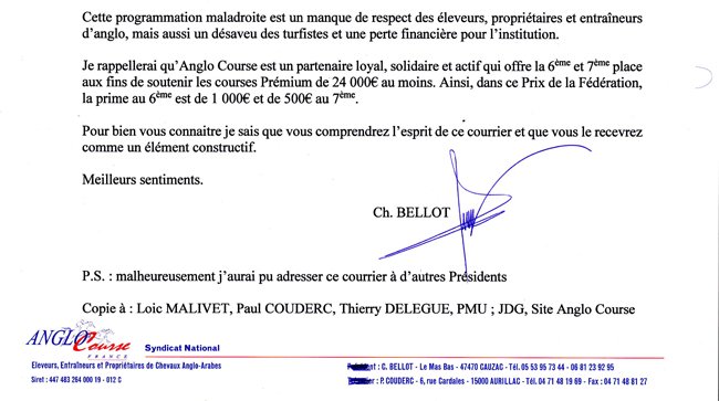 Toujours très actif Président d'Honneur du Syndicat AngloCourse, Christian Bellot défend bec et ongle le résultats des enjeux PMU des courses d'anglos dans les réunions prémium. Il écrit ainsi à Francis Montauban.