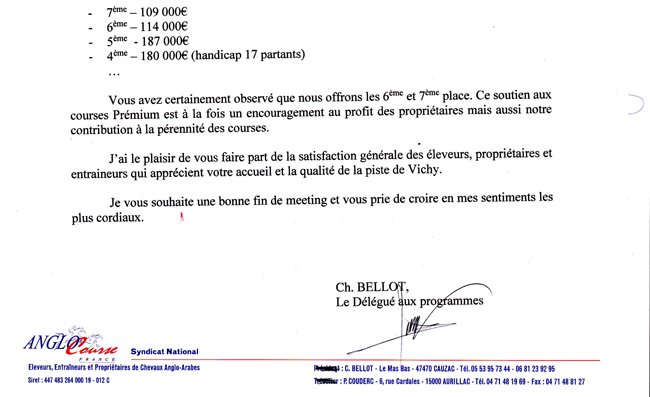 Délégué au programme du Syndicat AngloCourse, Christian Bellot se félicite des scores obtenus en terme d'enjeu par la dernière édition du Critérium d'Auvergne à Vichy lors de la grande semaine 2015. Il le fait savoir publiquement à Philippe Bouchara, le président de la Société des Courses.