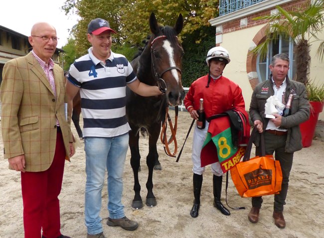 Don Tirso entouré de son entraineur Didier Guillemin, de son jockey Alexandre Gavilan, de son lad et de Paul Couderc, Président du Syndicat Anglo Course