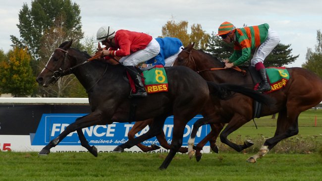 Don Tirso, casaque rouge, s'est offert Shrek et Coffeetime Pontadour dans le Prix du Ministère de l'Agriculture à 12,5% en 2015 à Tarbes