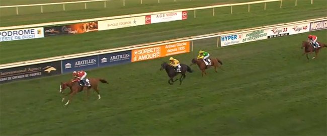 L'arrivée était sérrée dans la Poule d'Essai à 12,5% mais c'est bel et bien Feufolet Roc Marie et Yoritz Mendizabal (casaque jaune) qui triomphent devant Mossalis à son extérieur et Dayana Sourniac