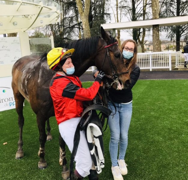Sous les masques, des femmes heureuses, artisanes indéboulonnables de la réussite de Fira en obstacle (© Twitter Hippodrome de Pau)