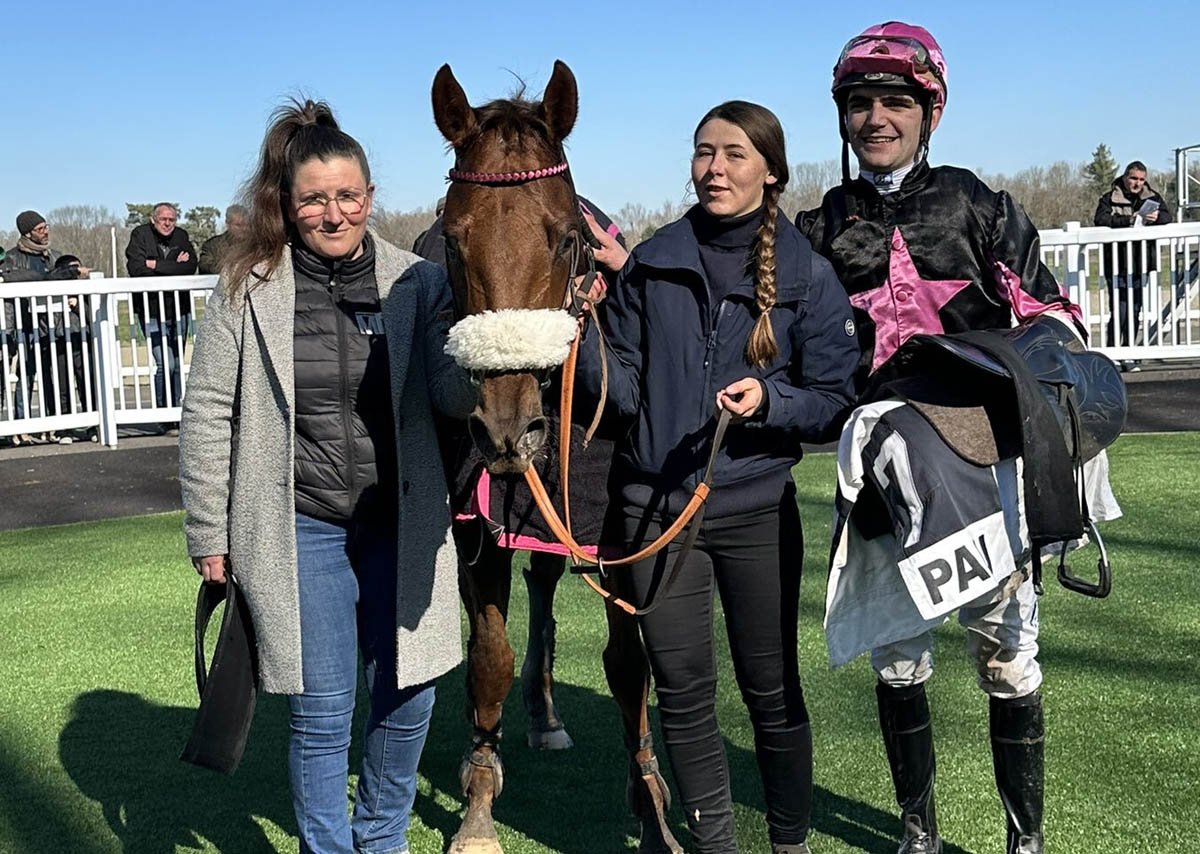 Louis Malpic, ses anges gardiennes et Clément Lefebvre, après sa victoire dans l'édition 2023 du Prix Amaury de Cazanove, à Pau (© Twitter Hippodrome de Pau)