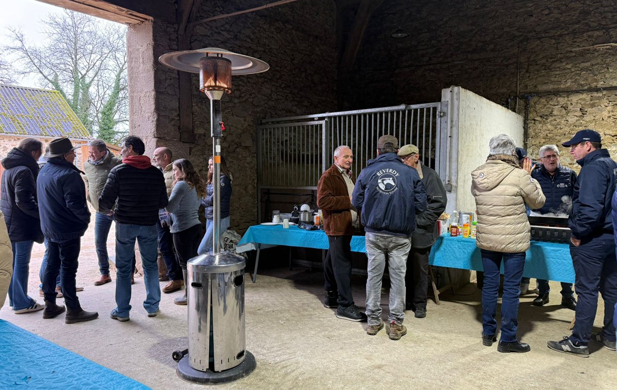 Harry de la Brunie tenu en main par son éleveur Jacques Crouzillac, en compagnie de Mathieu Talleux plein d'admiration, et Paul Couderc, le président de la Fédération AngloCourse.