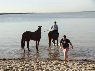 Pour les chevaux, nager équivaut à un bon canter. Il faut voir ça, les avions qui décollent de la piste, et en parralèle, les chevaux, c'est super. Il faut juste faire attention aux requins. Ils n'attaquent pas les chevaux car ceux ci ont de l'action, ils bougent les jambes, les sabots. Mais c'est vrai qu'il y a des requins comme partout dans l'hémisphère sud car les eaux sont chaudes. Mais ne vous faites pas, ce n'est pas dangereux.