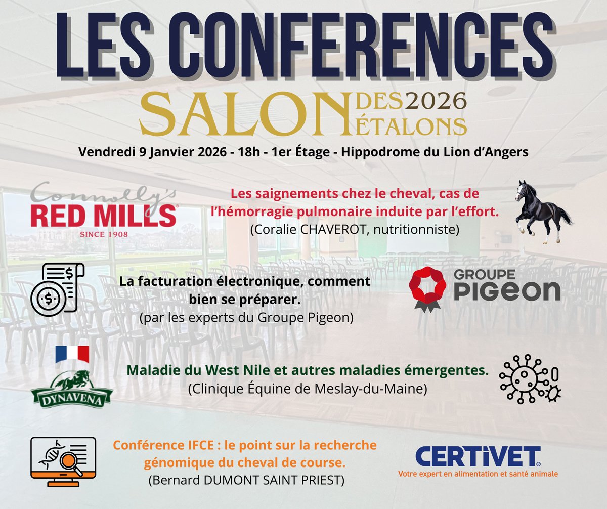 Le vendredi 9 janvier, veille de la présentation des étalonS, les conférences du Salon du Lion se tiendront à partir de 18H00 sur l'hippodrome du Lion d'Angers. Voir le programme des conférences ci-dessous. A suivre en direct sur France Sire TV.