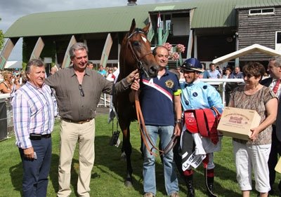 Frédérique Lingua (Osarus) remet le cadeau du sponsor, du bon vin de Bordeaux, à Jean-Bernard Eyquem, Jean-Claude Rouget et Mathieu Daguzan-Garros. Entre les réunions de La Teste et Deauville disputées le même jour, l'entraineur palois a gagné 7 courses !