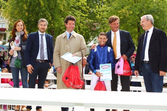 Ming Dynasty affectueusement récompensé par Umberto Rispoli pour leur victoire dans une Listed à Clairefontaine - Entraînement M.Mickël Delzangles