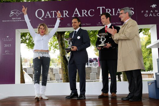 Une belle joie communicative sur le podium pour l'entraîneur hollandais Karin Van Den Bos. Deuxième sacre de groupe 1 à Longchamp pour son élève Samima, après l'Arabian Trophy des juments en 2013.