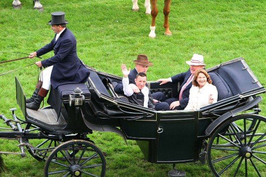 la promenade en calèche vers le podium avec l'entourage du crack