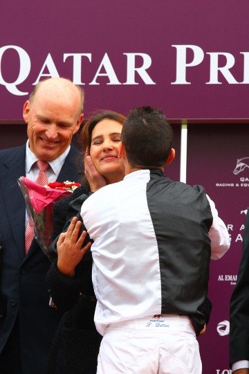 Une bise enthousiaste pour Virginie Ledoyen, ambassadrice de l'évènement, sous l'oeil de John Gosden qui décroche enfin son premier Arc
