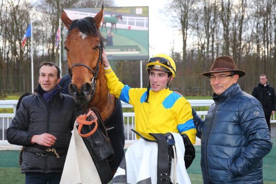 Louis-Philippe Beuzelin peut avoir le sourire - il fait coup double avec cette victoire, il ouvre son palmarès de jockey et celui de sa monture