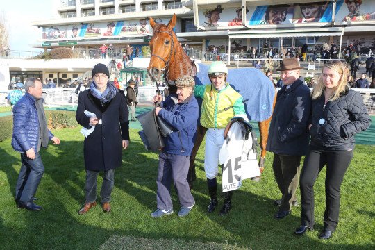 Tout le monde était présent pour le retour victorieux à Auteuil du lauréat du Grand Steeple-Chase de Paris 2014, Storm of Saintly : Jeannot Andt, son propriétaire, et Vincent Cheminaud, le jockey à l'époque du sacre.
